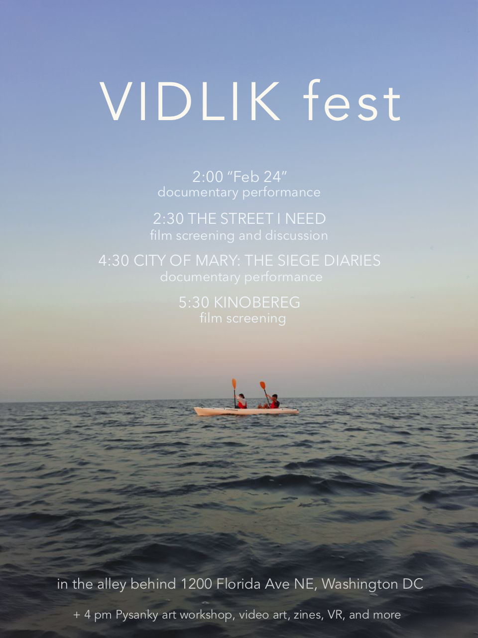 This performance opened VIDLIK FEST, a six-hour fundraising event I organized in collaboration with VIDLIK, a Ukrainian cultural organization working with youth in eastern Ukraine. The program featured collective film screenings—including The Street I Need and Kinobereg—readings of diary entries from Mariupol, and a Ukrainian pysanka (egg-painting) workshop.